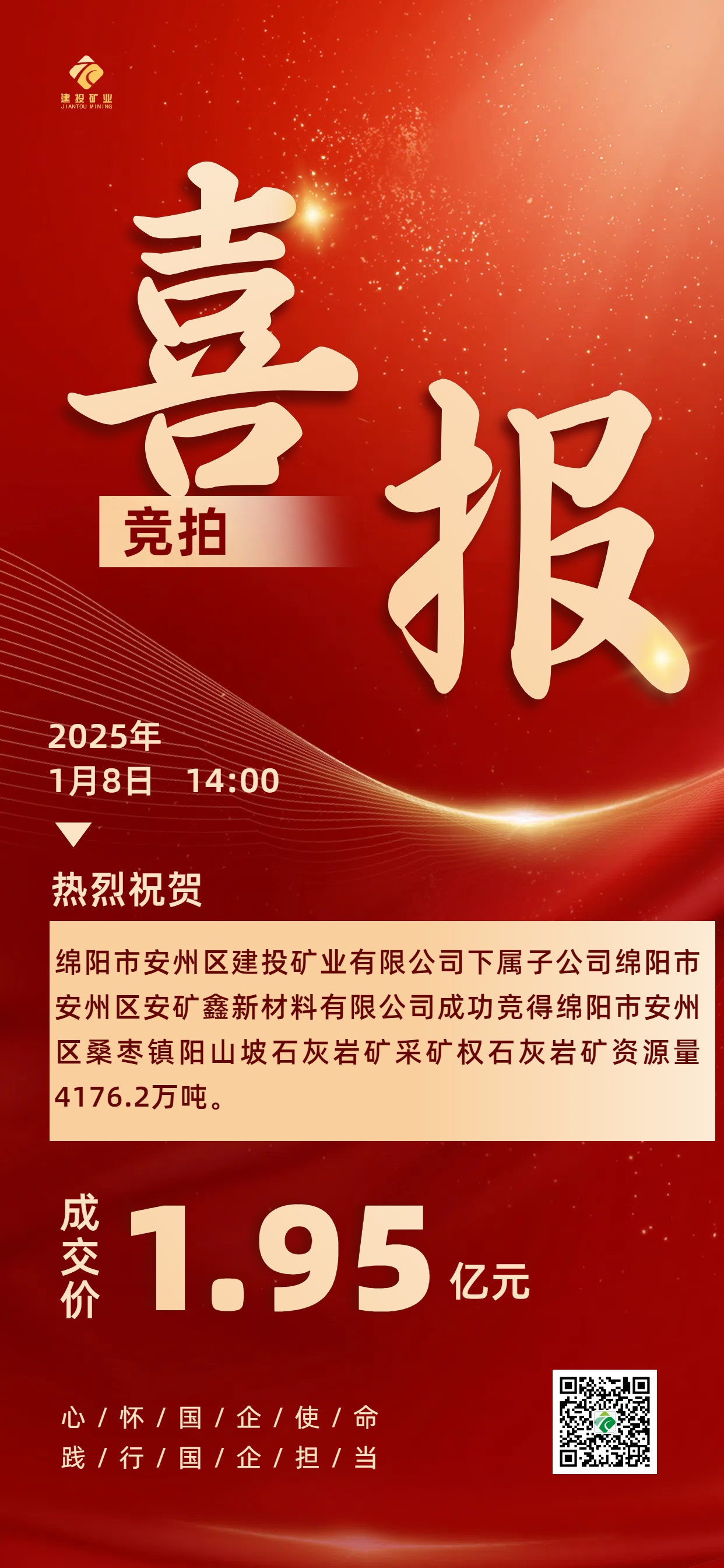喜報(bào)|綿陽(yáng)安州礦產(chǎn)資源集團(tuán)有限公司下屬子公司綿陽(yáng)市安州區(qū)安礦鑫新材料有限公司成功競(jìng)得綿陽(yáng)市安州區(qū)桑棗鎮(zhèn)陽(yáng)山坡石灰?guī)r礦采礦權(quán)