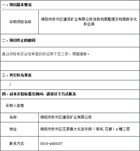 綿陽安州礦產(chǎn)資源集團有限公司選取檔案整理及檔案數(shù)字化供應(yīng)商流標公告