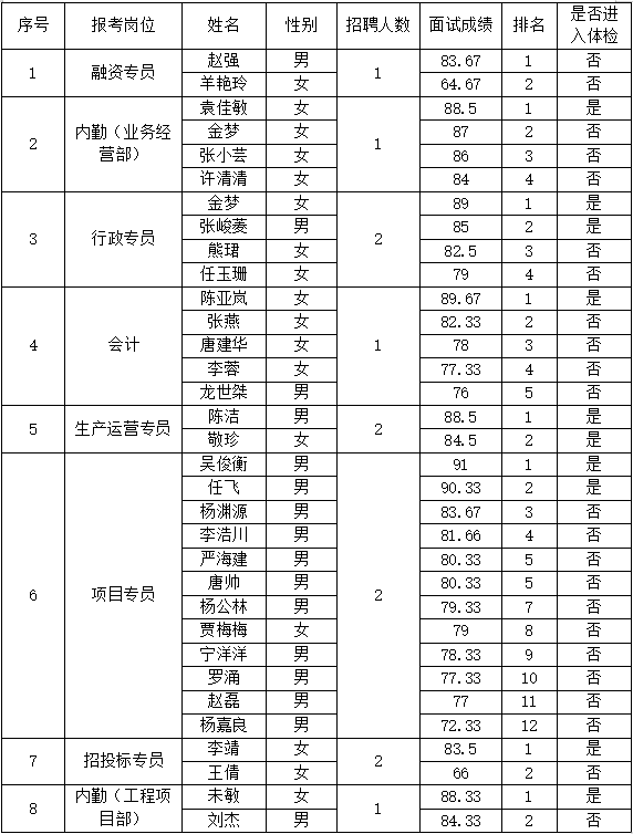 根據(jù)《綿陽(yáng)安州礦產(chǎn)資源集團(tuán)有限公司公開招聘(智聯(lián))2022年度工作人員面試工作方案》相關(guān)規(guī)定,現(xiàn)將面試成績(jī)、排名及是否進(jìn)入體檢公示如下: